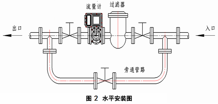 b、水平安裝(見圖2):水平安裝時(shí),流量計(jì)進(jìn)出口端軸線應(yīng)不低于管道軸線,以防止氣體中的雜質(zhì)滯留在流量計(jì)內(nèi),影響正常運(yùn)轉(zhuǎn)。同時(shí)應(yīng)使流量計(jì)法蘭與過濾器法蘭直接對(duì)接。